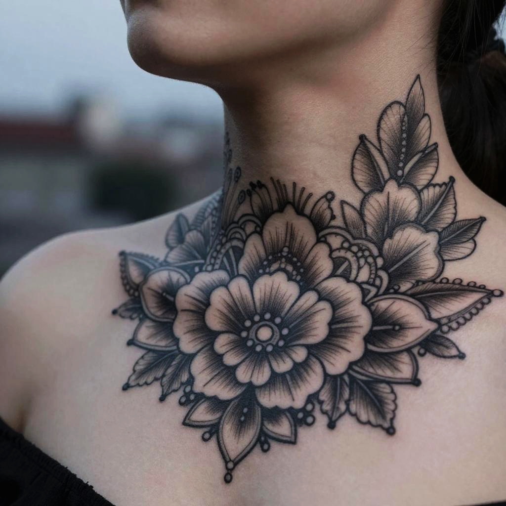 Close-up of a black throat tattoo featuring elaborate floral and mandala elements, inked on a graceful neck, set against a blurred urban background at dusk, showcasing sharp details and high contrast between dark ink and pale skin.