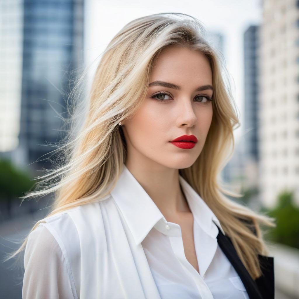 Portrait of a stylish young blonde woman with long hair and red lipstick, wearing a white blouse and black vest. She is looking over her shoulder against the backdrop of modern urban buildings and a blurred cityscape, captured with natural soft lighting and shallow depth of field.