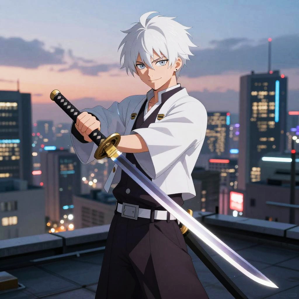 White anime boy with messy white hair and a confident smirk, wielding a glowing katana, standing on a rooftop overlooking a cyberpunk cityscape at dusk.
