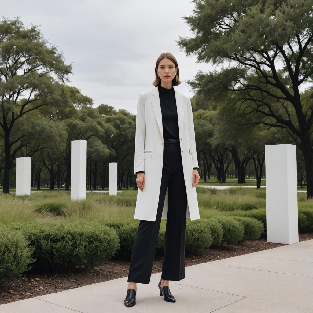 Tall and slender woman standing in a contemporary sculpture park wearing a monochrome minimalist outfit. She is dressed in a tailored Holm Oak white blazer over a black fitted t-shirt paired with black wide-leg trousers and black leather block heels. The outfit is complemented by a minimalist watch, creating a look of modern understated elegance. The setting features clean concrete benches and lush green trees in an artistic outdoor environment.