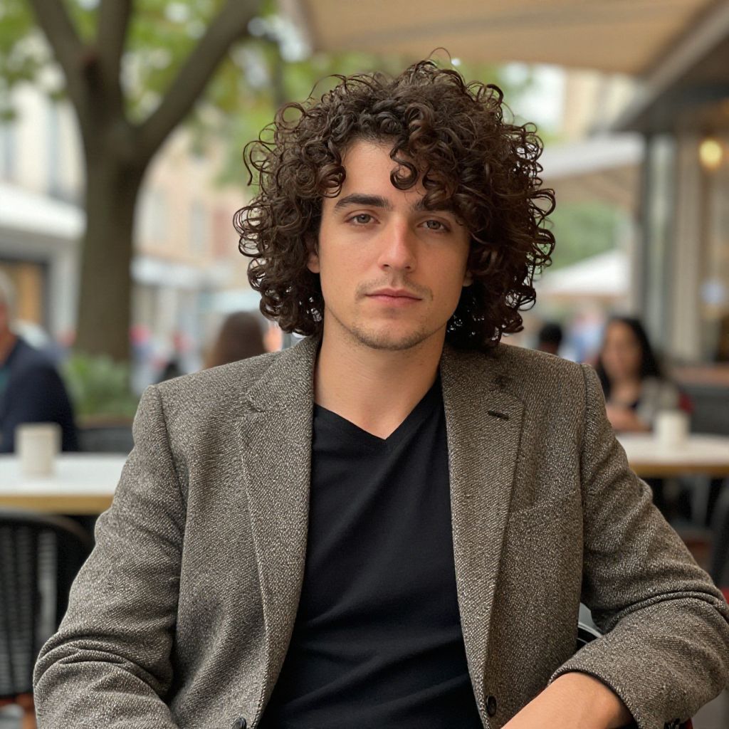 Photograph of a man with short dark hair, wearing a black shirt, sipping a white coffee cup at an outdoor café at dusk, with colorful