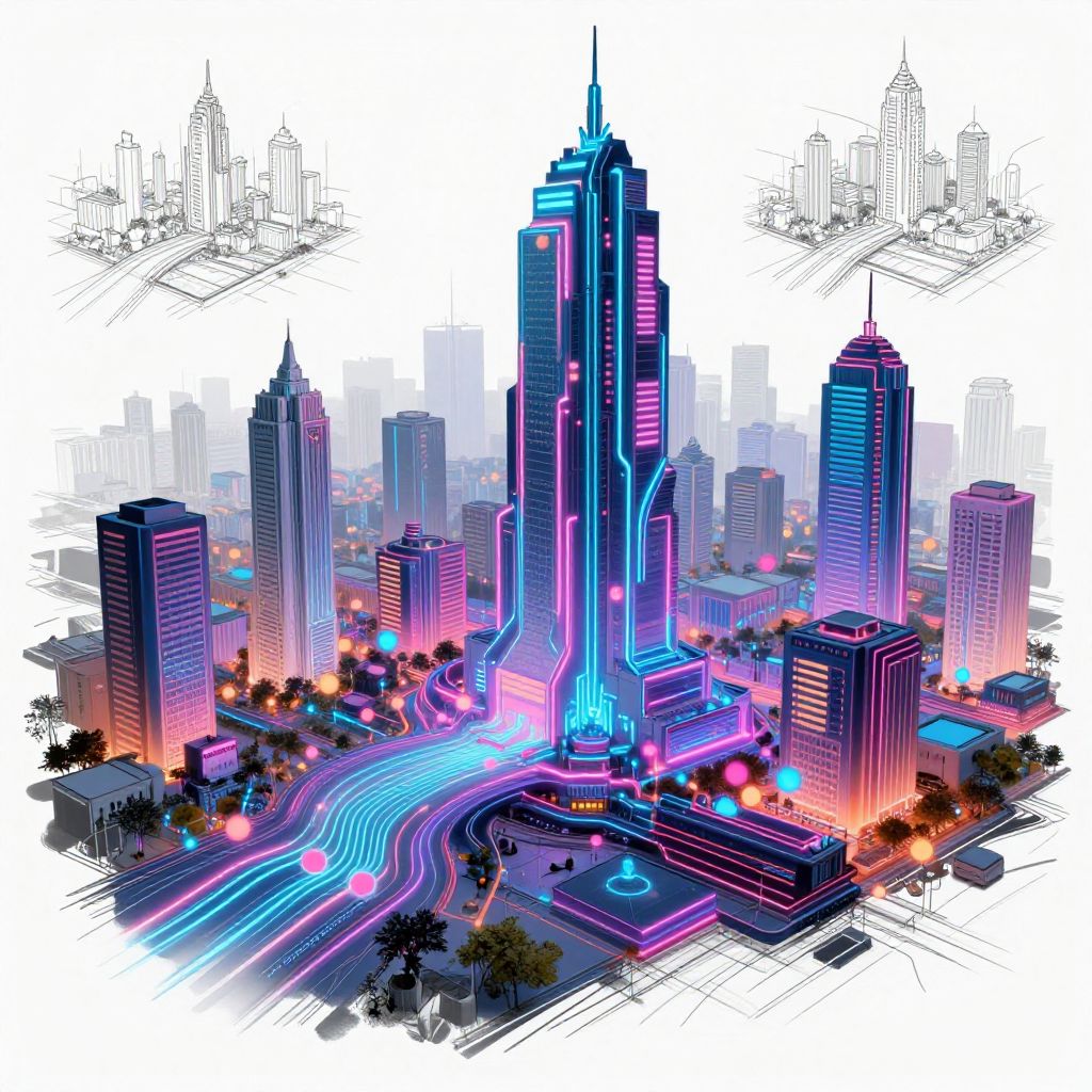 A vibrant, digital illustration of a futuristic cityscape at night. Central skyscrapers, illuminated in neon blue and pink, dominate the scene. A winding road, also glowing with neon lights, snakes through the city. Surrounding buildings are outlined in black with minimal detail. Palm trees dot the streets, and small, glowing streetlights add to the neon effect. In the background, a faint, sketched outline of a larger city skyline is visible. The overall style is hyper-realistic with a cyberpunk aesthetic, emphasizing bright, contrasting colors and dynamic light patterns.