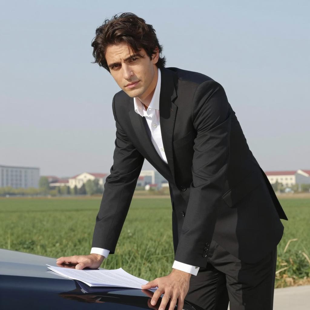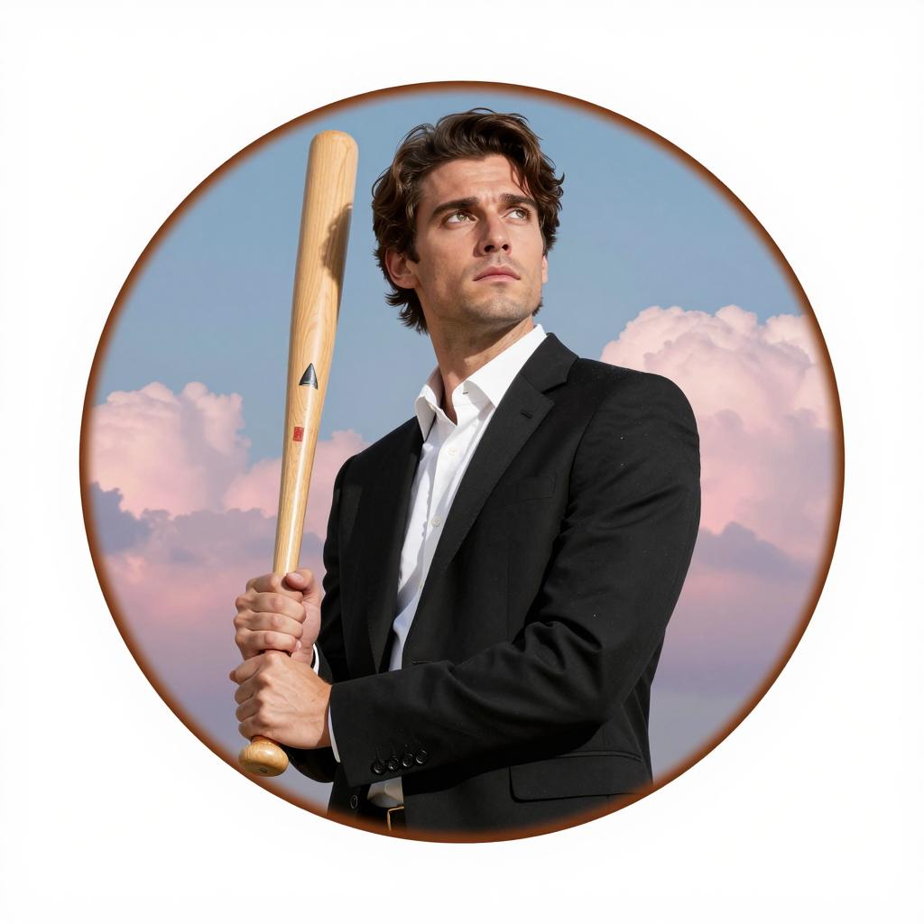 Man with dark brown hair, wearing a black suit and white shirt, gripping a wooden bat. He looks upward, with a serious expression. Background includes a blue sky with pink clouds. Framed by an oval shape with burnt edges.