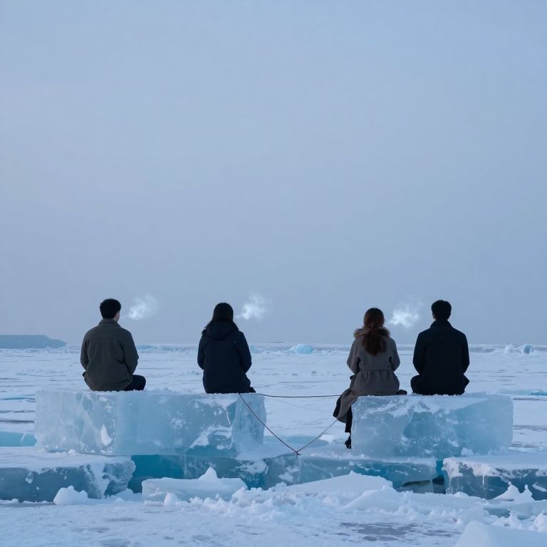 Photograph of four silhouetted individuals, two men and two women, sitting on large, translucent ice blocks in a vast, icy ocean. The sky is a pale blue, and sunlight reflects off the ice. The people wear winter clothing, including coats and hats, and are connected by a thin rope. The ice blocks are surrounded by broken ice and snow, creating a stark, cold landscape. The scene exudes a serene, yet chilly atmosphere with a minimalist color palette dominated by blue and white tones.