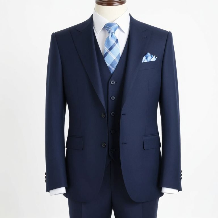 Custom-made navy blue wedding suit featuring a three-piece ensemble with a fitted jacket, vest, and trousers, complemented by a light blue plaid tie and matching pocket square, displayed on a mannequin against a clean white background.