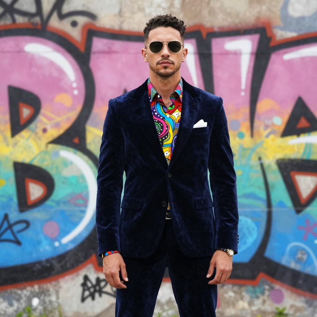 The image features a stylish man standing confidently against a vibrant graffiti wall. Dressed in a chic velvet suit and a colorful patterned shirt, he embodies a modern yet artistic fashion sense that complements the urban background.