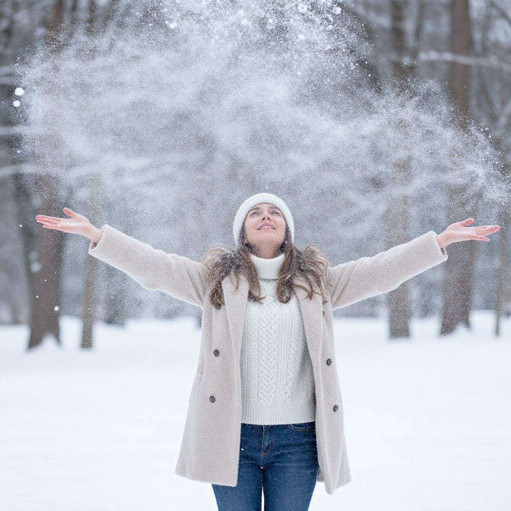 Woman joyfully spreading her arms wide as snowflakes cascade around her in a serene winter landscape.
