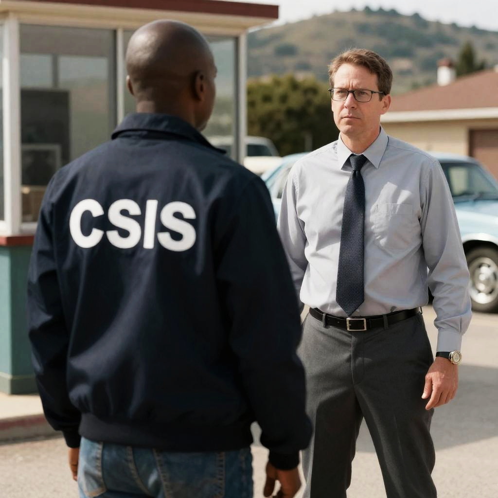 Photograph of two men standing outdoors. Black man with bald head, back to camera, wearing dark CSIS Crime Scene Investigation jacket. White man with glasses, light gray shirt, dark tie, and gray pants, facing black man. Glass booth in background, old cars to the right. Sunlit, hilly landscape. Black man's back, white man's serious expression.