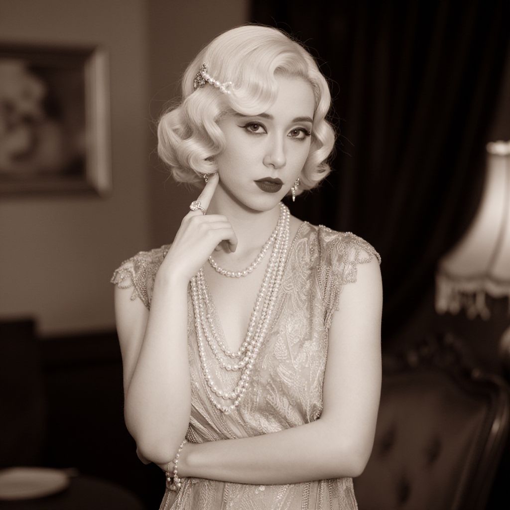 Loiro-haired person in vintage fashion attire, 1920s style with finger waves and pearl accessories, sepia-toned image with modern sharpness, elegant pose in an old-fashioned parlor setting, blending retro aesthetics with contemporary clarity.