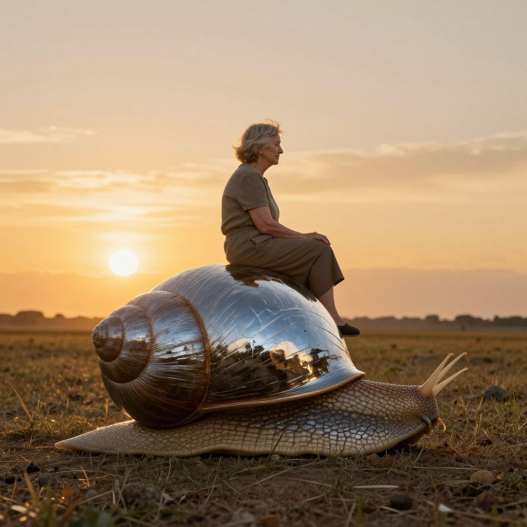 An elderly woman sits serenely atop a colossal snail with a gleaming chrome shell, traversing a surreal landscape where the horizon melts into a golden sunset, defying the bounds of scale and reality.