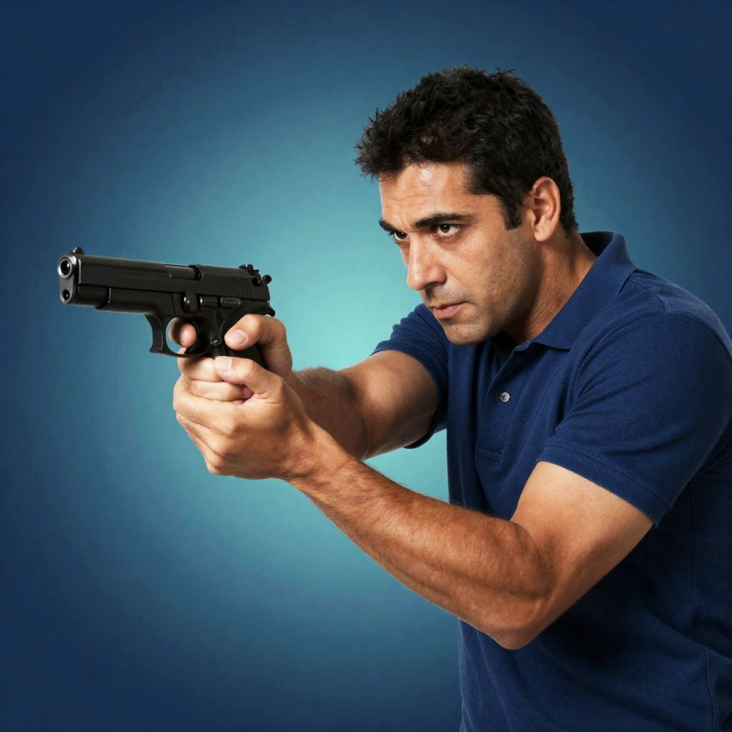 Photograph of a middle-aged man with short, dark hair, wearing a blue polo shirt, holding a black handgun in his right hand. He is in a crouched stance, aiming forward with a determined expression. Background is a gradient of blue to teal with a soft light glow. Man is positioned on the right, handgun in the foreground.