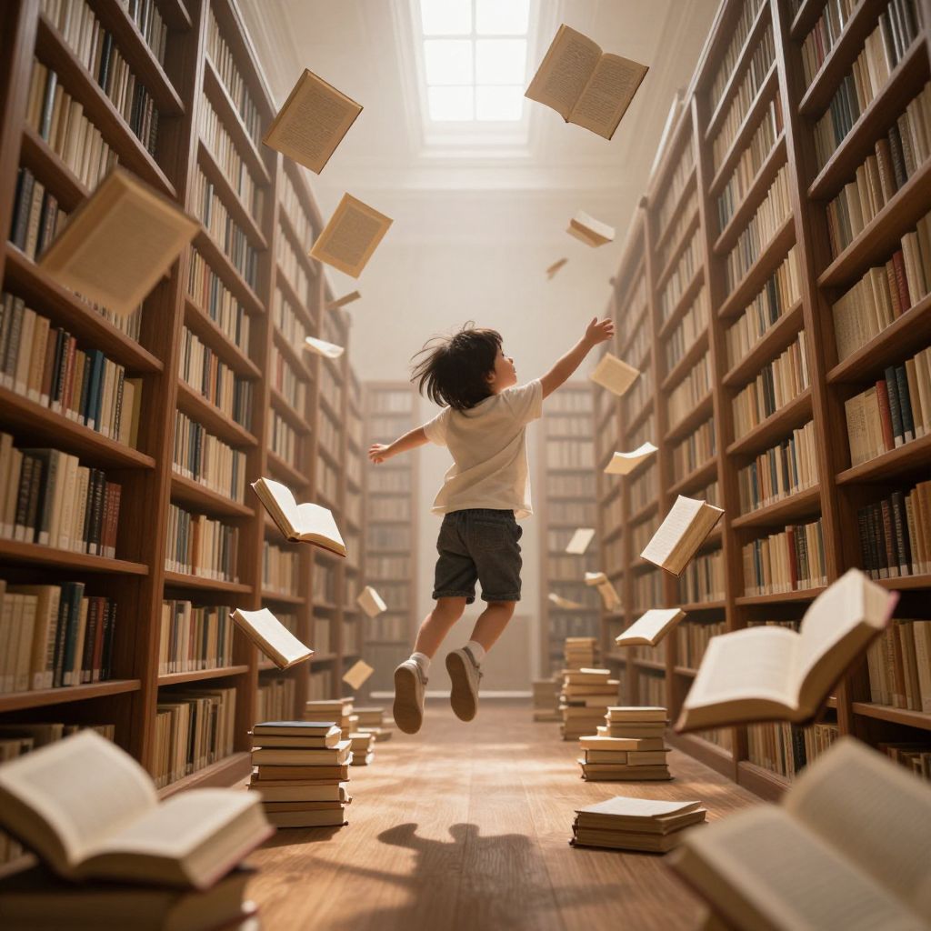 A digital illustration depicts a young child with short black hair, wearing a white shirt and blue shorts, joyfully leaping down a sunlit library aisle. Books of various sizes and colors float around the child, some mid-air while others are stacked on the wooden floor. Tall, dark wooden bookshelves line both sides of the aisle, filled with more books. The bright sunlight from the ceiling creates a warm, inviting glow, highlighting the child's playful motion and the floating books. The scene exudes a whimsical, magical atmosphere.
