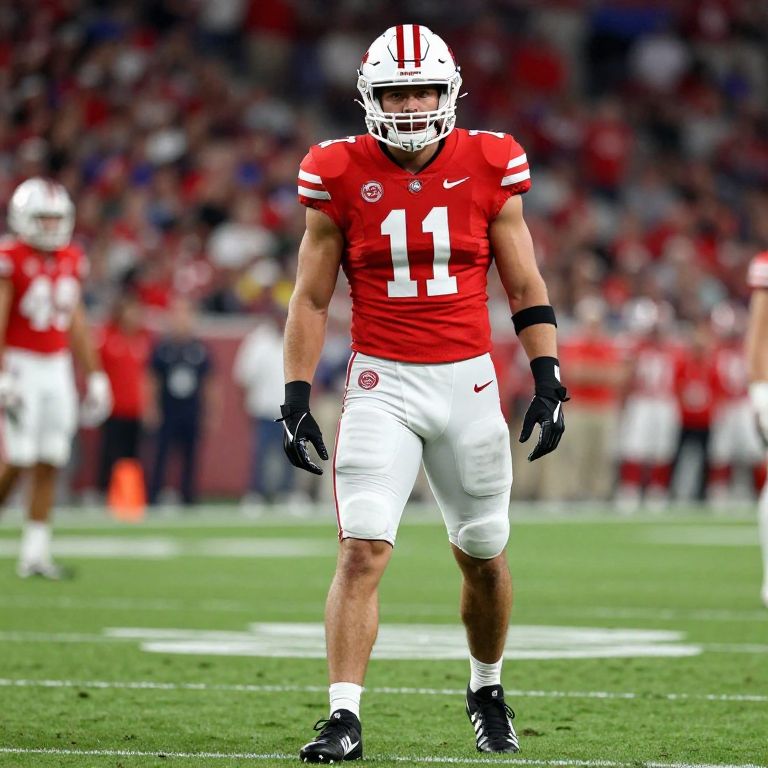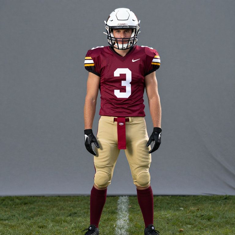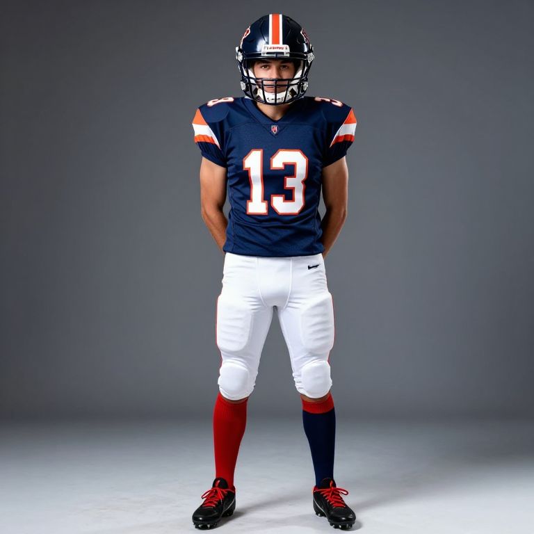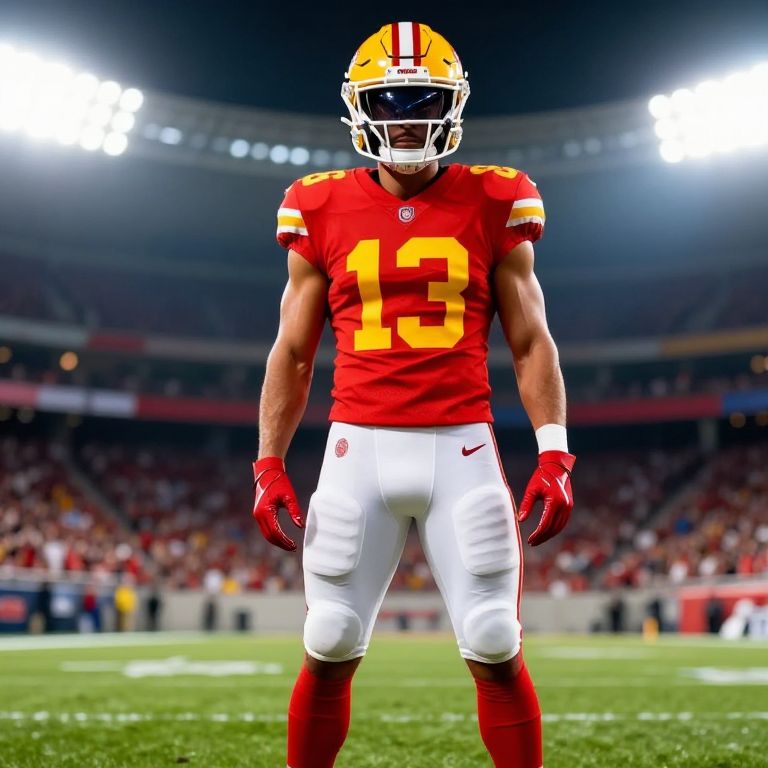 Photograph of a male football player standing against a white background. He's wearing a red and white uniform with the number 13 on his chest, white pants with red stripes, black and red cleats, and a white helmet with a red stripe. He's got a serious expression, gloves on, and is standing with his feet shoulder-width apart. The lighting is bright, making the colors pop.