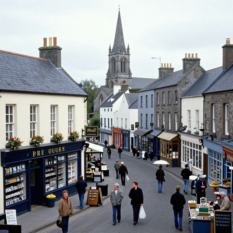Figure a busy market town in ireland in 1985 with pubs, electrical, hardware stores, food shops, church in the background, people going about their business and talking on the street,