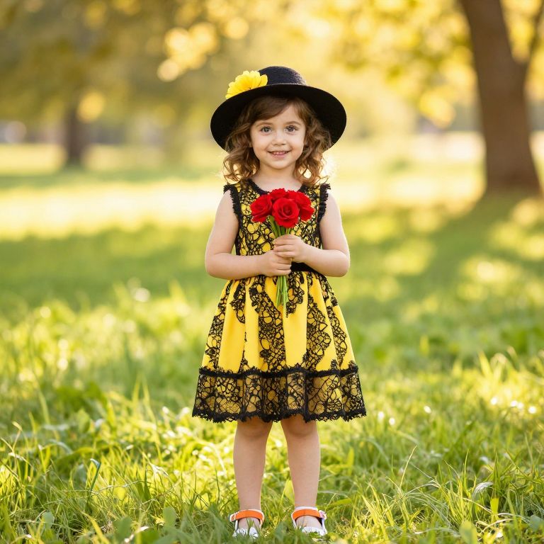 A young girl with soft, curly brown hair and bright, curious eyes stands in a sunlit meadow, wearing a yellow dress with a delicate black lace pattern, a black hat adorned with a vibrant yellow flower, and white shoes featuring orange straps. She holds a small red bouquet in her hands, smiling warmly at the viewer, with golden sunlight filtering through the trees in the background, creating a cheerful and whimsical atmosphere.