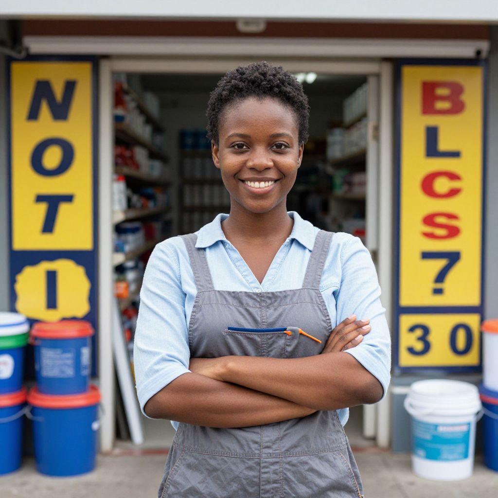 Photograph of a smiling Black woman with short, curly hair standing in front of a hardware store. She has dark skin and is wearing a white collared shirt under gray overalls with a small pocket. Her arms are crossed over her chest. The hardware store's entrance is behind her, featuring yellow and black vertical signs with "NOTO" and "ELTS" in bold letters. Various paint cans and buckets are visible in the background. The image has a sharp focus on the woman, with a slightly blurred background, emphasizing her as the main subject. The overall style is bright and colorful.