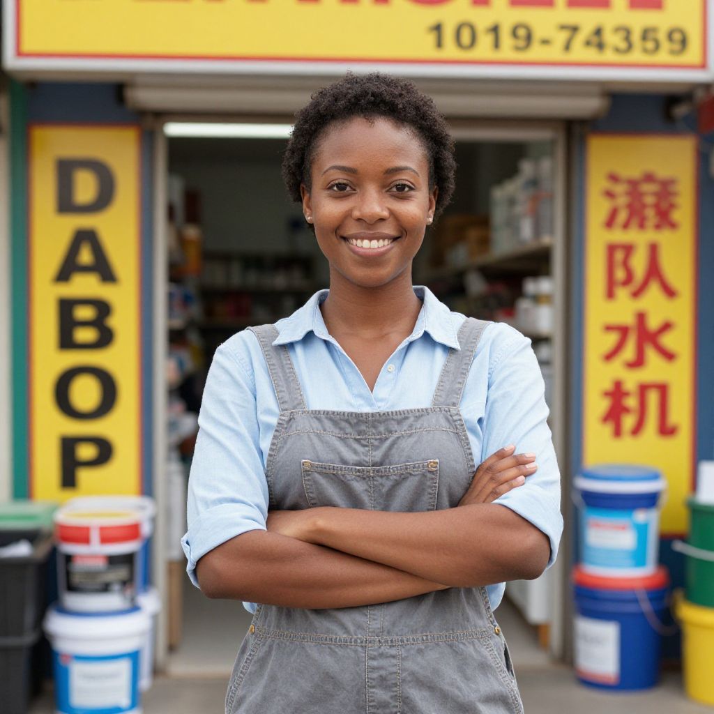 Smiling confidently, a Black woman with her arms crossed stands in front of a paint store entrance, wearing a light blue shirt and gray overalls, surrounded by colorful signage and buckets.