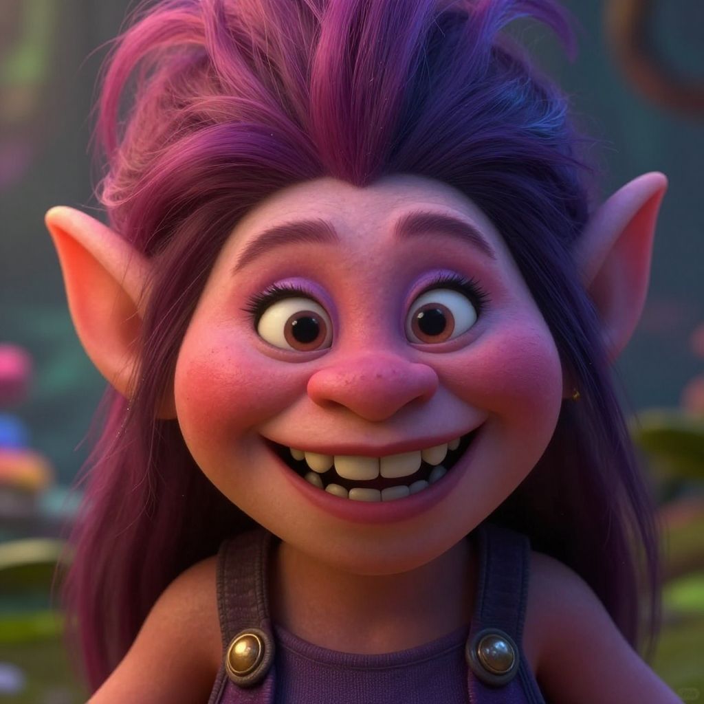Female troll face with exaggerated mischievous grin, detailed fantasy style, vibrant colors, troll-like skin texture, whimsical background, cinematic lighting