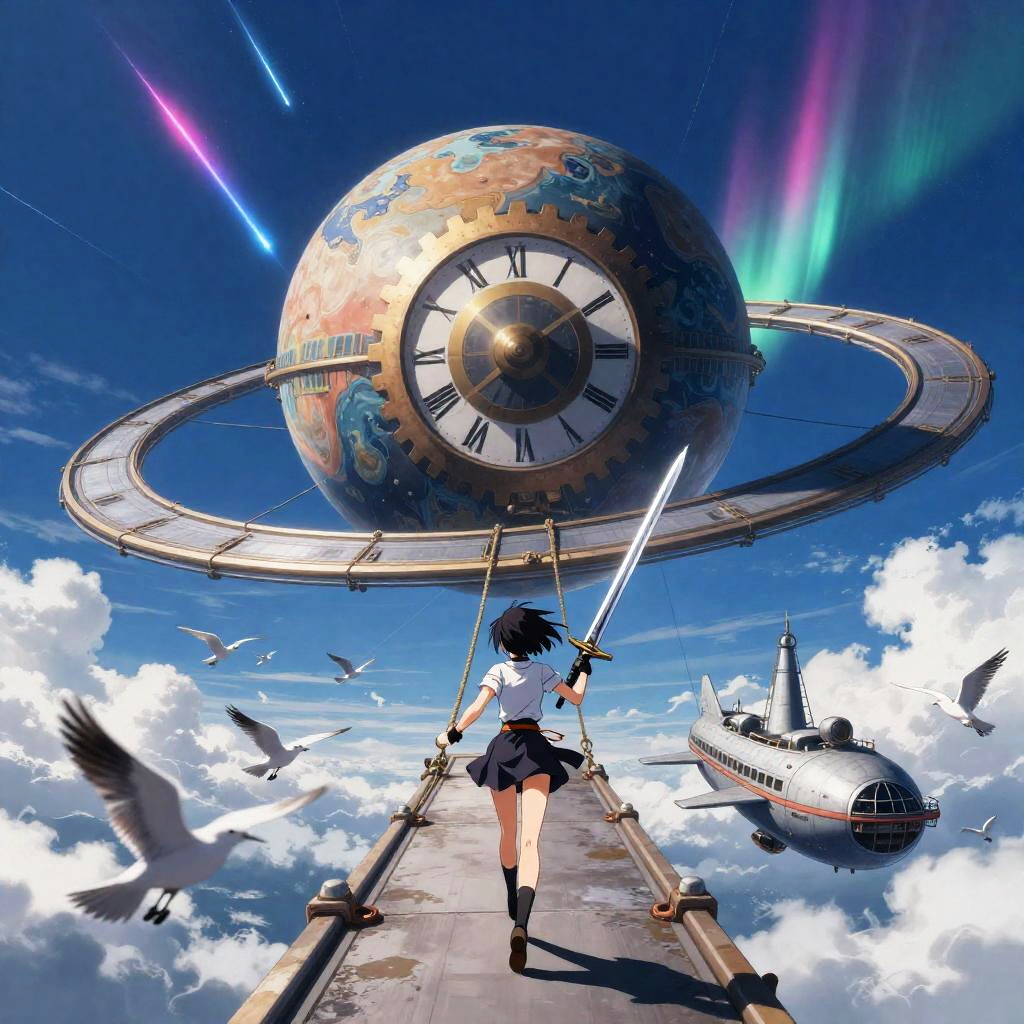Clockwork Courier Swordswoman, Artist 2, Surreal, mysterious, bizarre, fantastical, fantasy, sci-fi, Japanese anime, orbital elevator wharf tethered to a colossal ringed planet under streaking meteor showers and neon auroras, miniskirt beautiful swordsman running towards the airship on the tethered rope, perfect voluminous body, blue sky, clouds, detailed masterpiece bird’s eye views