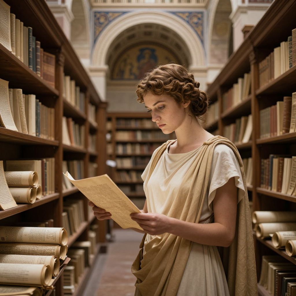 Photograph of a young Caucasian woman with light brown, wavy hair styled in an ancient Roman fashion, standing in a dimly lit, ornate library aisle. She wears a cream-colored, short-sleeved tunic with a beige drapery over her right shoulder. She is intently reading a parchment scroll held in both hands. The background features tall, wooden bookshelves filled with rolled parchments and books, stretching into the distance. The ceiling has decorative arches and frescoes. The lighting creates a warm, nostalgic atmosphere, highlighting the woman's focused expression and the textures of the parchment and fabric.