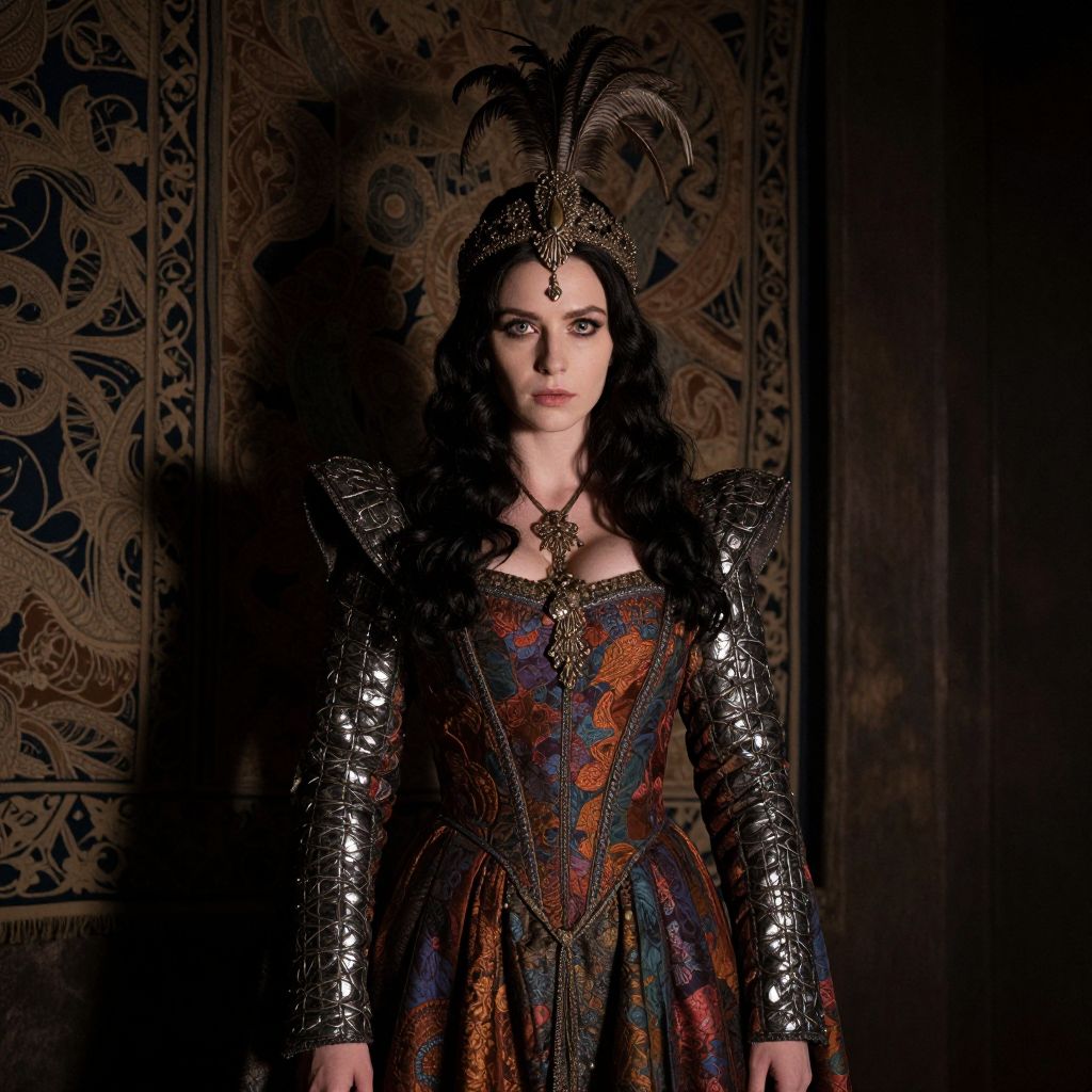 A cinematic shot of a mysterious medieval noblewoman in elaborate costume — rich brocade robes, silver-threaded sleeves, and a high headdress with feathers — standing inside a dimly lit tower room lined with tapestries; she has dark, wavy hair, a piercing gaze, and a pale complexion, lighting highlighting the intricate fabric details and the shadows around her.. The woman has big tits and cute face