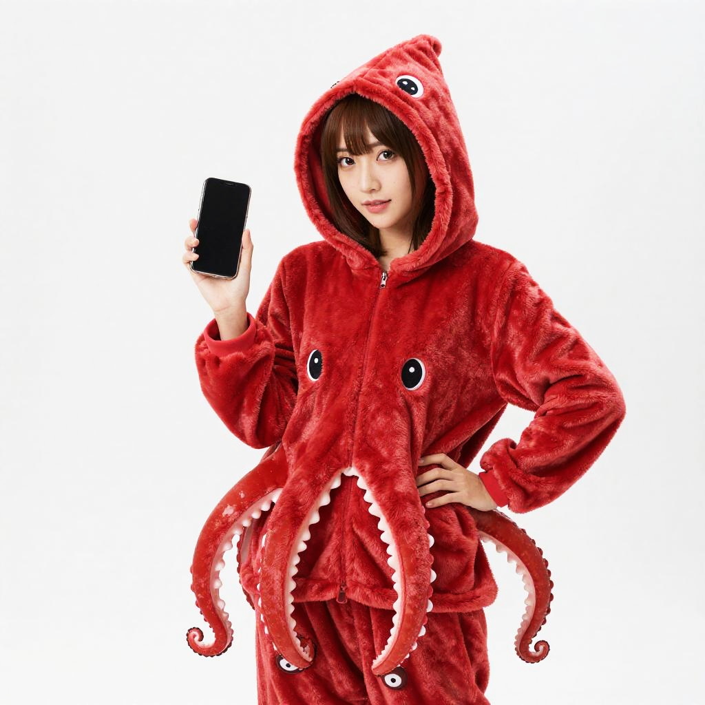 Red Octopus Kigurumi Pajama, a woman in a red octopus costume holding up a cell phone