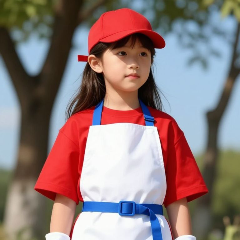 A young girl with long brown hair is wearing a red cap and a red shirt with a white apron. The apron has a blue strap across the front, and the girl has white gloves on her hands. She is standing in front of a tree with a blue sky in the background.