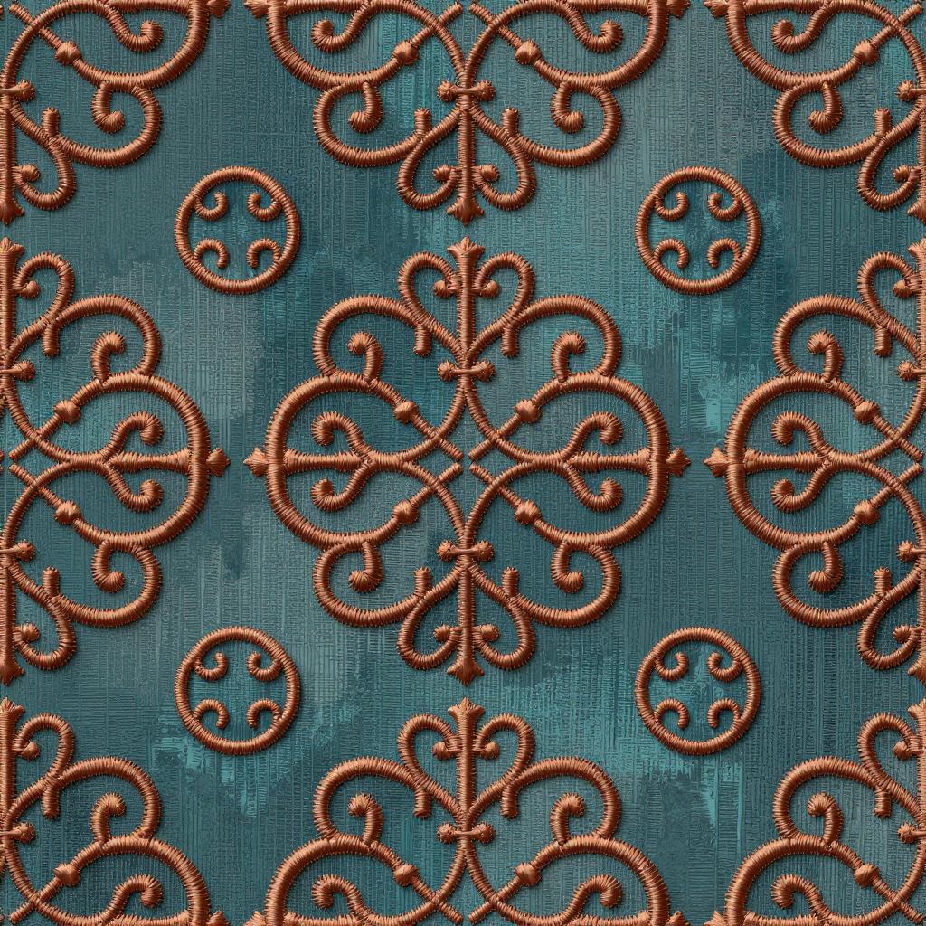 Scrollworks pattern featuring tattoo-style scrollwork with bold outlines and negative space in oxidized copper scrollwork on weathered teal arranged as seamless repeating wallpaper pattern with interlocking flourishes on ornate invitation or certificate background rendered as embroidered look with thread-like texture and stitches, ultra-detailed, sharp ornamental design, high resolution, intricate decorative pattern art