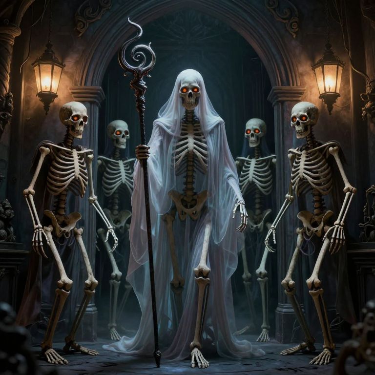 In this eerie scene, a group of five skeletal figures, each with glowing orange eyes, emerge from a dimly lit, arched doorway. The central figure, a tall and imposing specter, holds a staff adorned with a swirling design, exuding an otherworldly aura. Flanking this figure are four other skeletons, each with a unique pose and expression, their bones and clothing draped in a ghostly, ethereal manner. The room is adorned with ornate, twisted lanterns casting a soft, ghostly light, enhancing the haunting atmosphere. The overall composition is balanced, with the skeletons arranged in a semi-circle around the doorway, creating a sense of unity and cohesion. The interplay of light and shadow, combined with the intricate details of the skeletons' anatomy and the ornate surroundings, creates a vivid and unsettling visual experience.