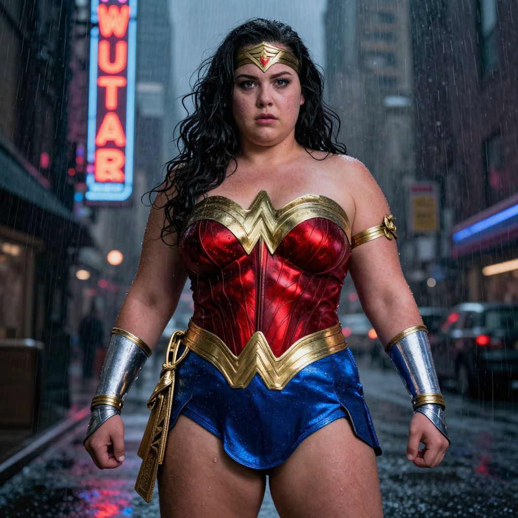 A morbidly obese Wonderwoman in a red, blue, and gold outfit stands in a dark, stormy cityscape, with rain falling and a neon sign visible in the background.
