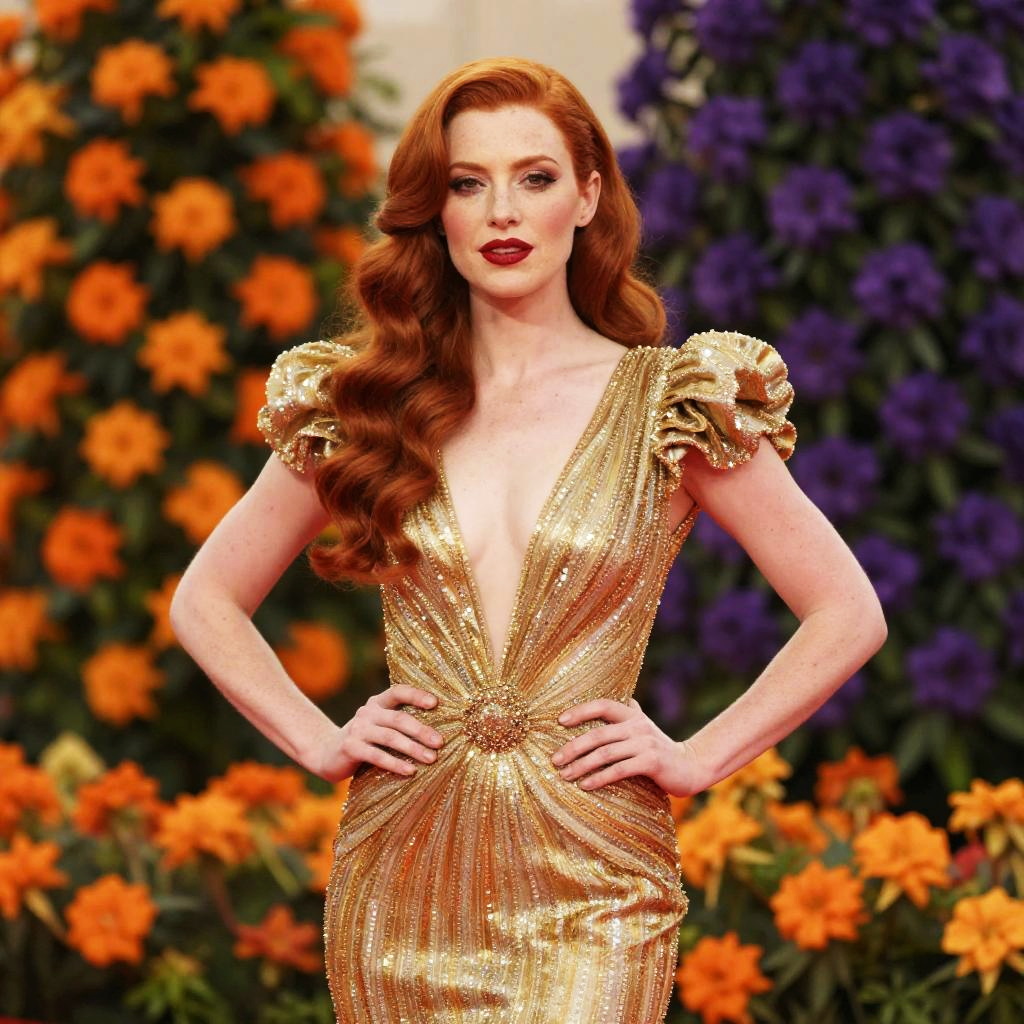 Photograph of a fair-skinned woman with long, wavy red hair, standing confidently with hands on hips. She's wearing a sparkling gold, deep V-neck gown with puffed sleeves, accentuating her slender figure. Her makeup is bold with red lipstick. The background is a vibrant display of orange and purple flowers, adding a lively contrast to her shimmering dress.