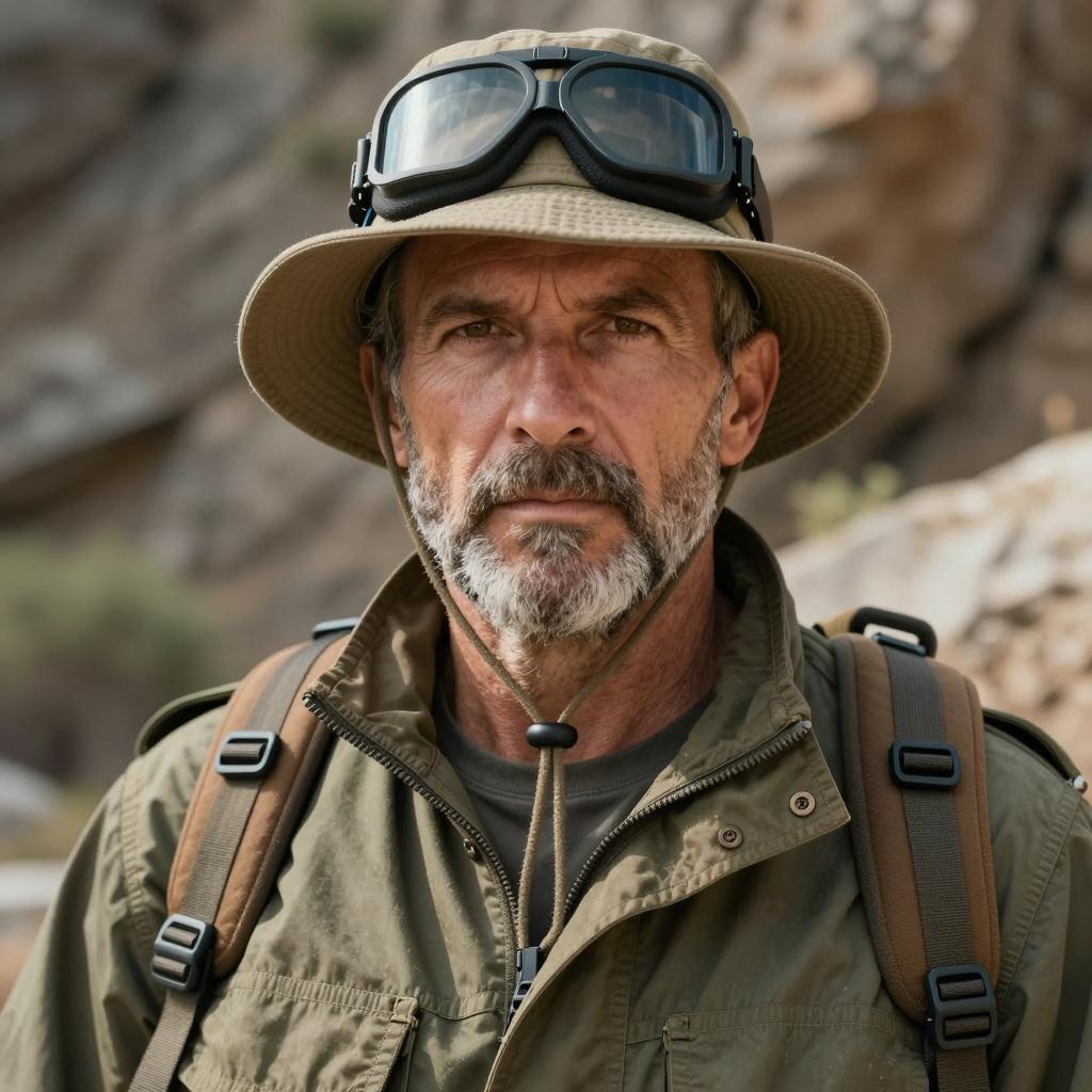 Camouflage costume, photorealistic photo of middle-aged man standing on sunny sidewalk, wearing camouflage hooded jacket with buttons, black gloves, black backpack, serious expression, background shows blurred trees and pavement, daytime, natural light, realistic ure, autumn setting, casual style, outdoors, man centered in frame, slightly off-center, medium shot, natural colors
