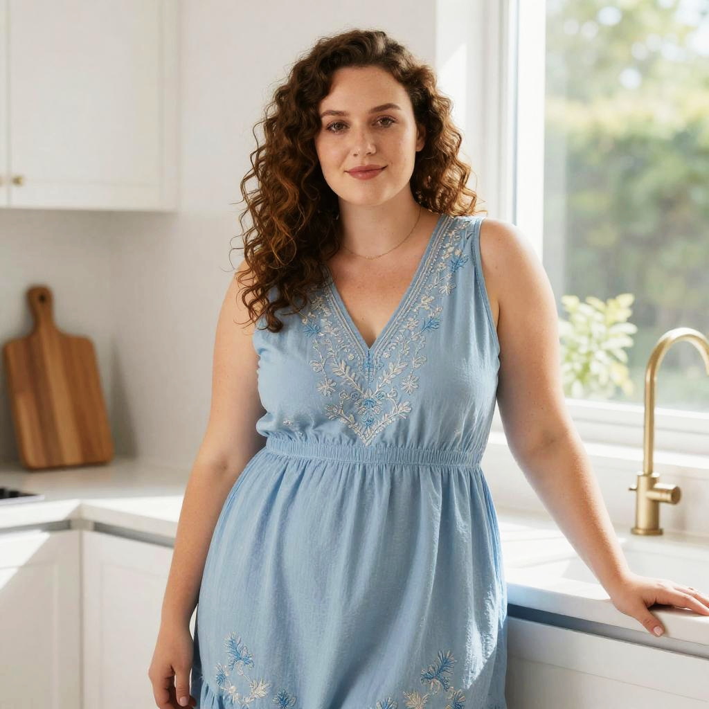 Photograph of a pregnant woman with long brown hair, wearing a light blue polka dot sundress, standing in a bright, modern kitchen.