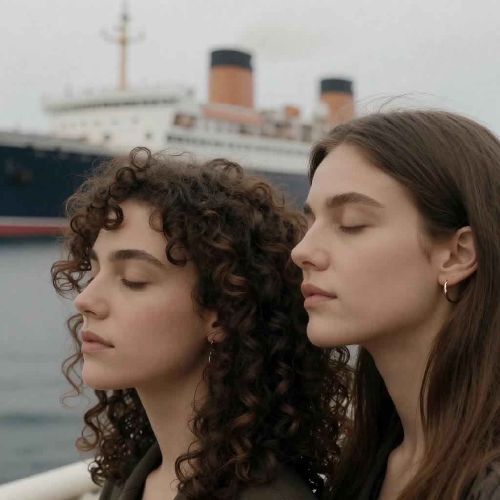 Photograph of two women with curly and straight brown hair leaning closely, eyes closed, wearing earrings. Large ocean liner with smokestacks in background, partially obscured by mist. Women's profiles in foreground, ship in background. Soft light.