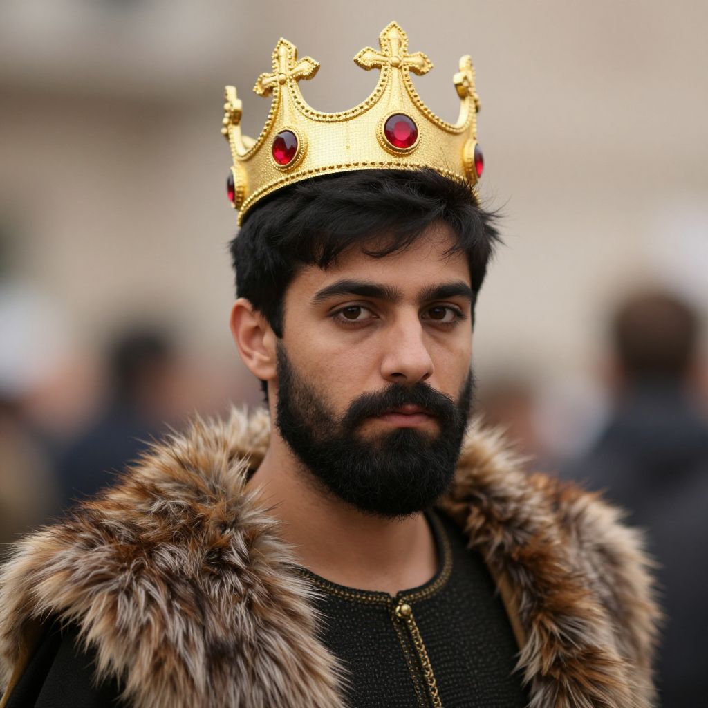 Photograph of a bearded man with dark hair, wearing a gold crown, black fur-trimmed cloak, and embroidered emblem, standing in a
