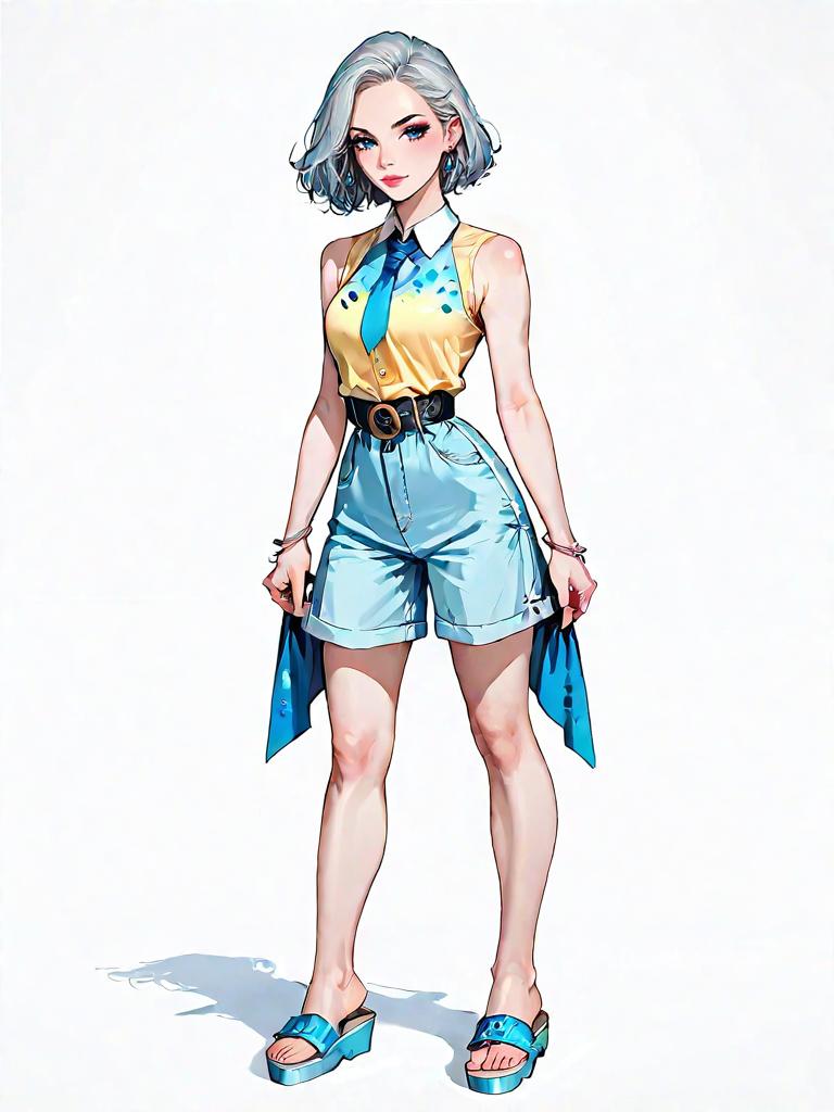1girl, source_comics, realistic face, full body shot, Woman, preppy, white top with black polka dots, keyhole neckline, three-quarter sleeves, green flared mini skirt, high waist with thin brown belt, minimalist gold bangle.