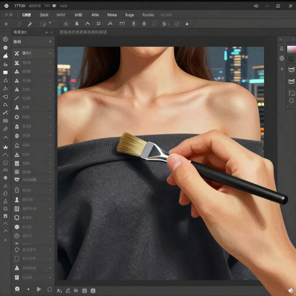 Photograph of a woman's upper body in a dark, off-the-shoulder sweater, taken within a digital editing software interface. She has light skin and long dark hair. Her right hand, with slender fingers, holds a black-handled brush with a gold-bristled tip, touching the sweater's fabric. The background shows a blurred cityscape at night with illuminated buildings. The software interface has various tools, layers, and settings on the left side, including a toolbar with icons and adjustment sliders. The image has a realistic, high-detail aesthetic, blending the digital editing environment with the photograph.