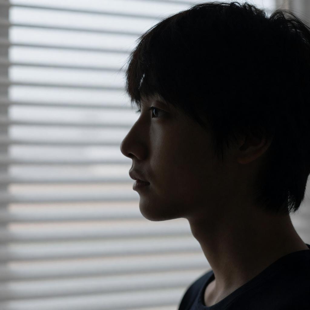 Profile view of a young Asian man with short, slightly messy black hair, standing near a window with horizontal blinds. The photo features low lighting with the subject’s facial features mostly in shadow, highlighting a moody and intense expression. The bright background contrasts with the dark foreground, emphasizing the silhouette effect.