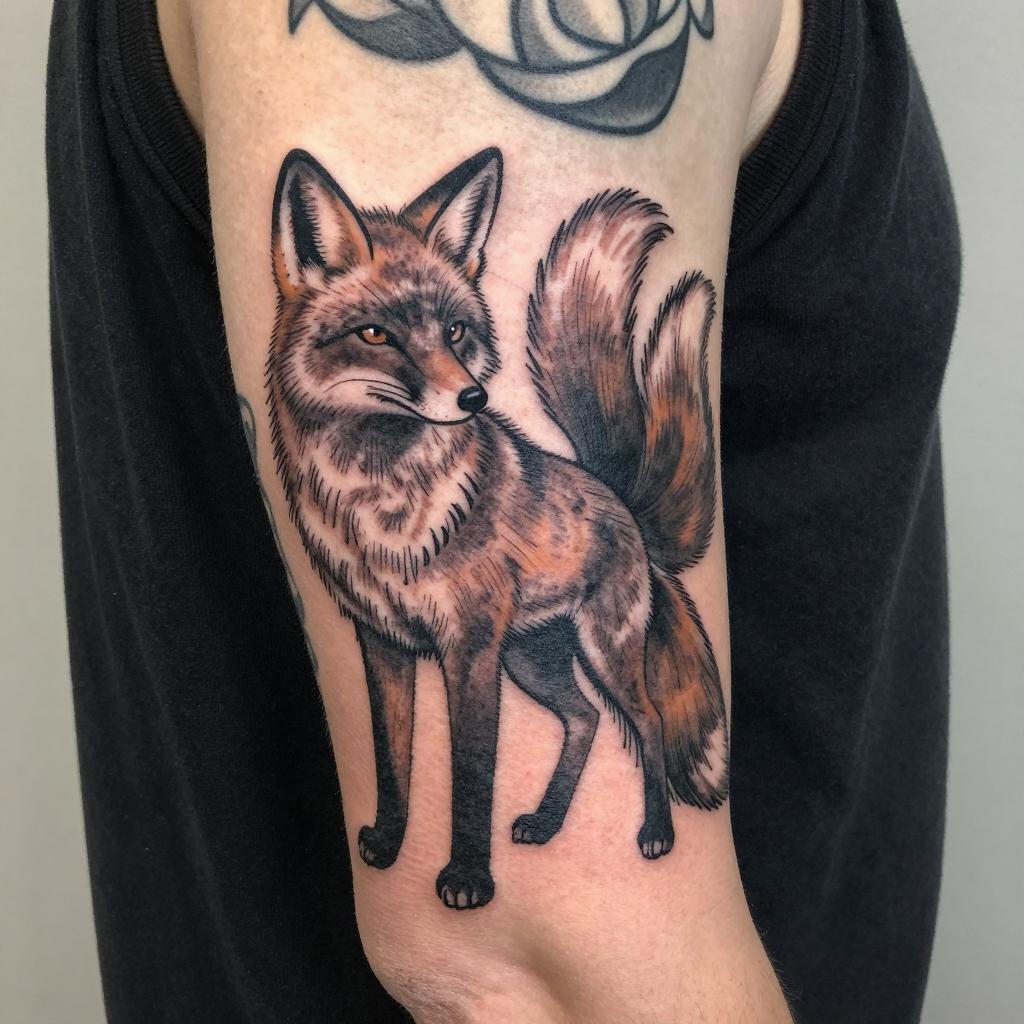 Colorful Fox Tattoo with Flames on Upper Thigh