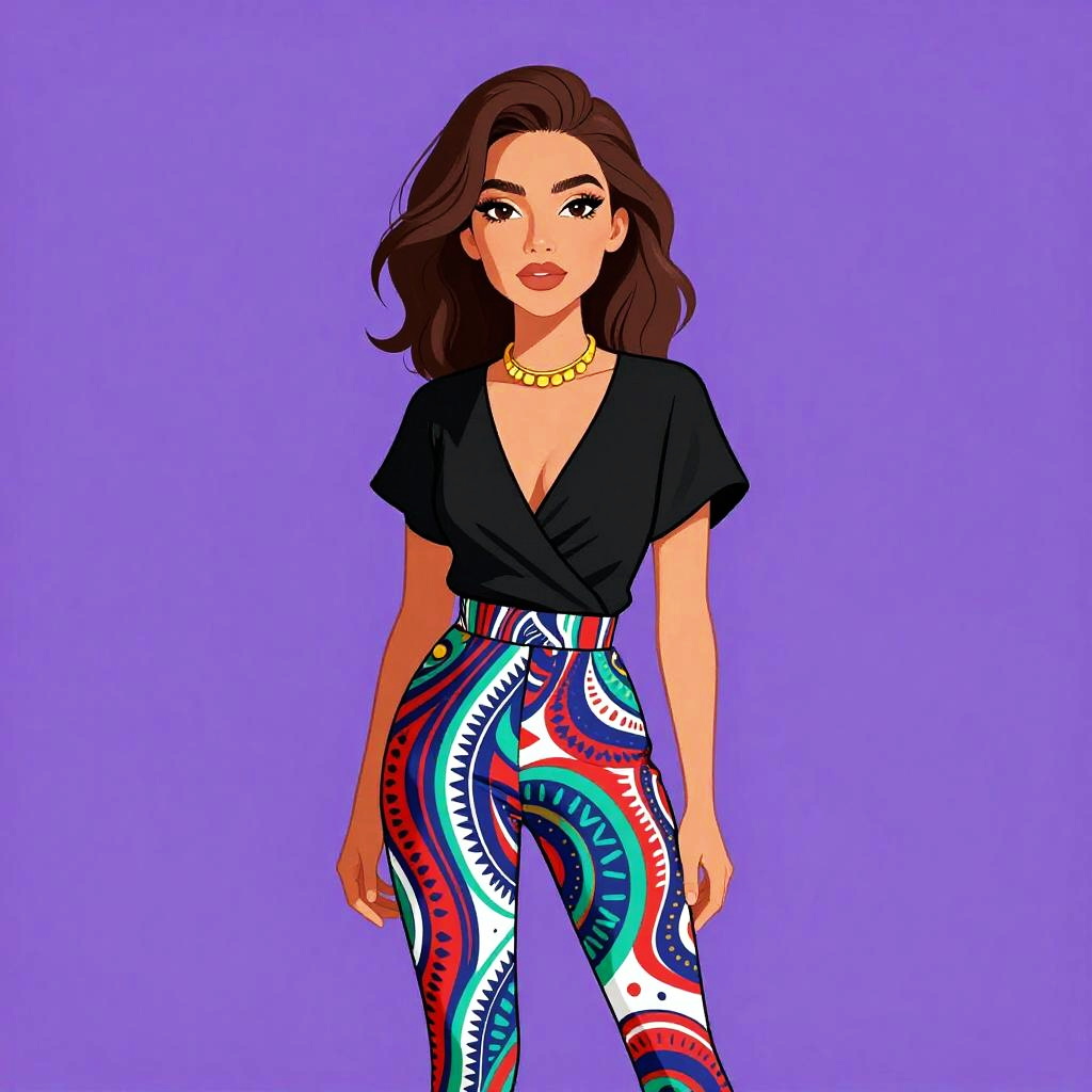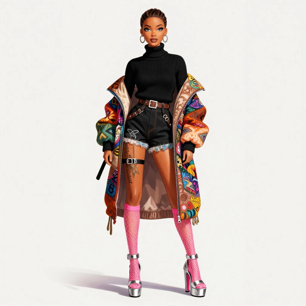 Bohemian girl, wearing a black turtleneck sweater, an extravagant multicolor patchwork jacket with highly detailed attire, warm tan skin, high fashion modern whole body drawing, realistic female anime portrait, Barbie-inspired, outfit featuring a earth tones dominant palette, harness, choker, pink net socks, silver accessories, platform heels, minimalistic background, eye-catching and stunning, cute face, looking at viewer, tattoo
