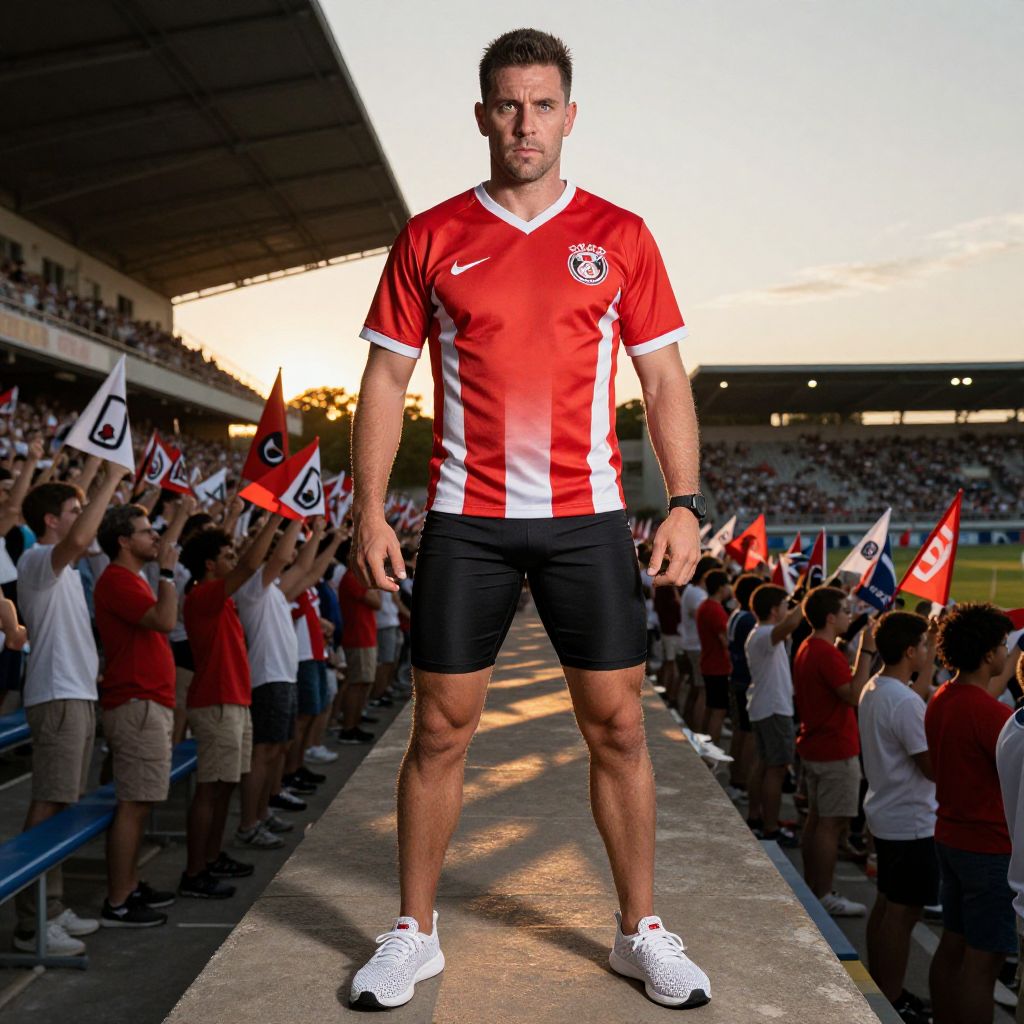 Photograph of a muscular male soccer player in red and white striped shirt, black shorts, white sneakers, standing on stadium platform, with cheering fans holding