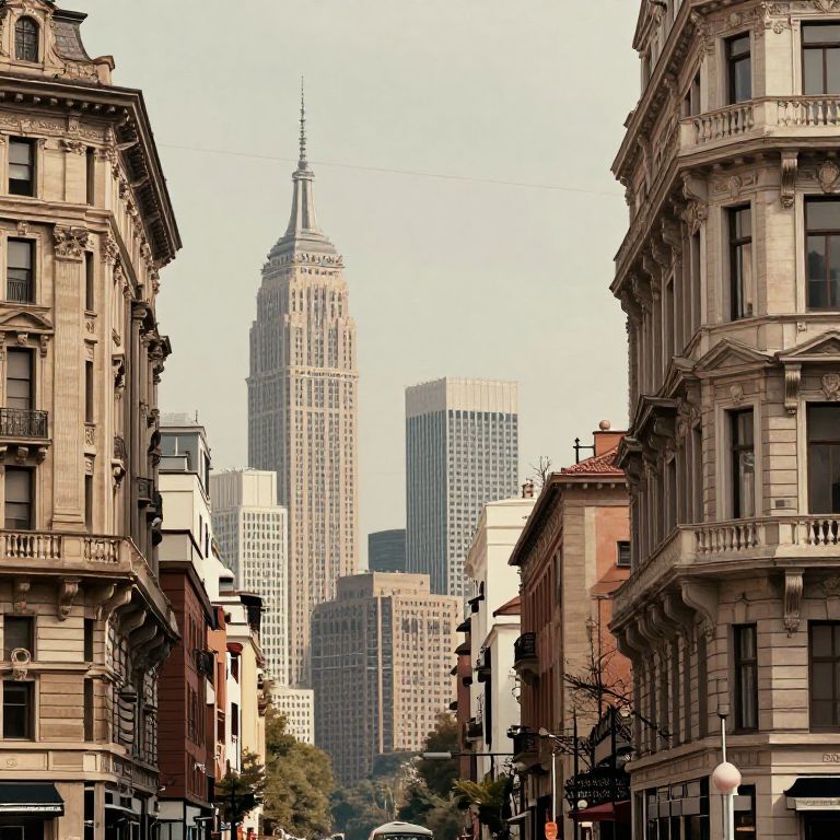 Photograph of a narrow urban street flanked by ornate, beige buildings, leading to the towering, iconic Empire State Building in the distance. Bright