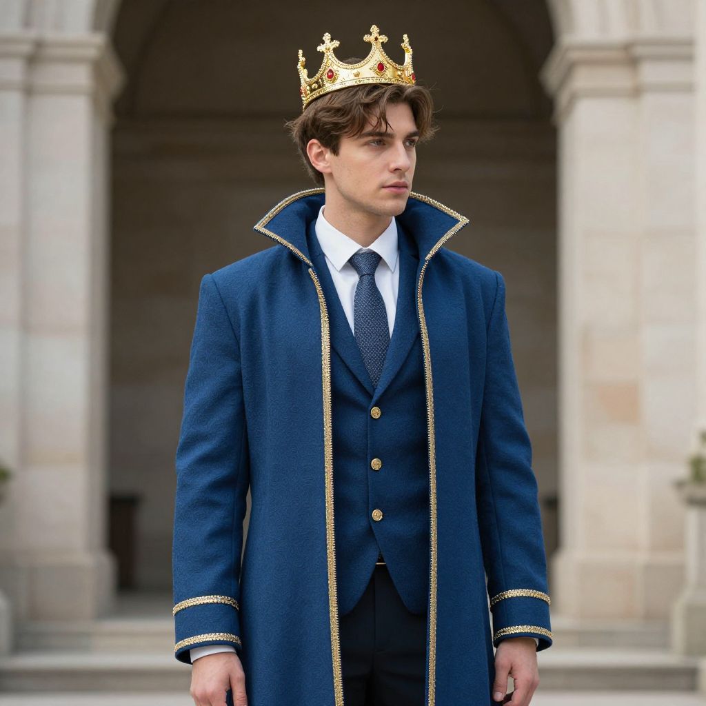 Photograph of a young, fair-skinned man with brown hair, wearing a gold crown with intricate designs. He is dressed in a royal blue, three-piece suit with gold trim, a white shirt, and a black tie with small gold dots. His coat is long with a high collar and gold edging. He stands in front of a stone archway with blurred, light-colored stone pillars in the background. His expression is serious and contemplative. The overall style is regal and formal, evoking a royal or monarchic theme.