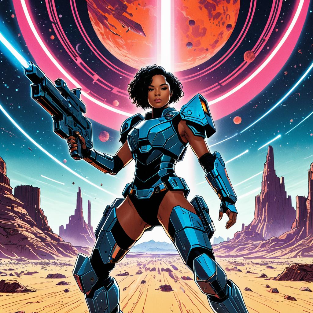 Tessa Thompson, as a futuristic space punk gladiator, gigantic hovering fortress above a desert planet, combat with a suit of heavy mech armor shooting plasma beams, energetic neon manga, art by Makoto Kobayashi