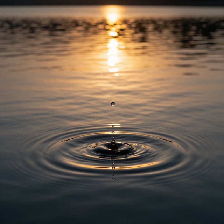 Photograph of a single water droplet hitting a calm lake, creating ripples, with a bright sunset reflected on the water.