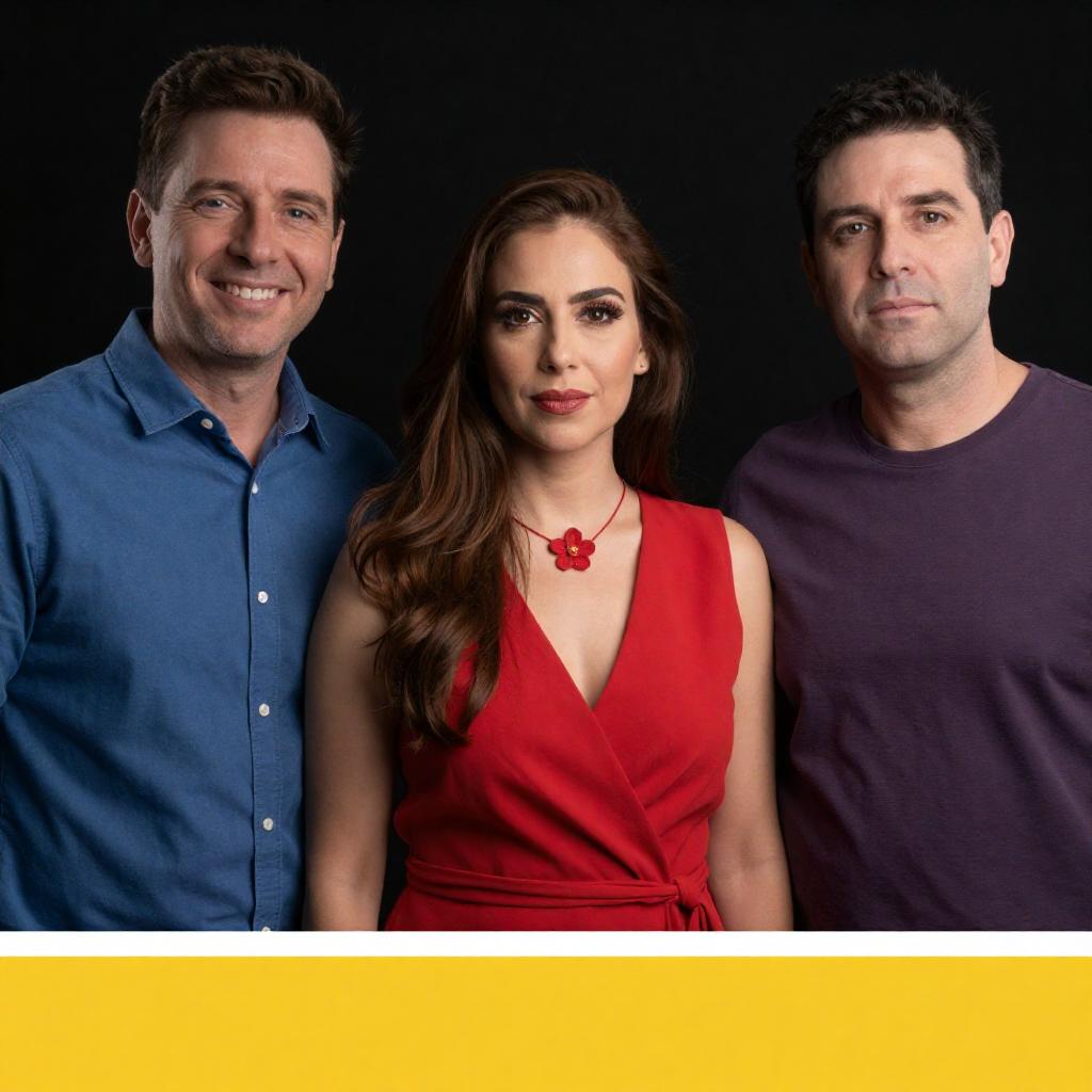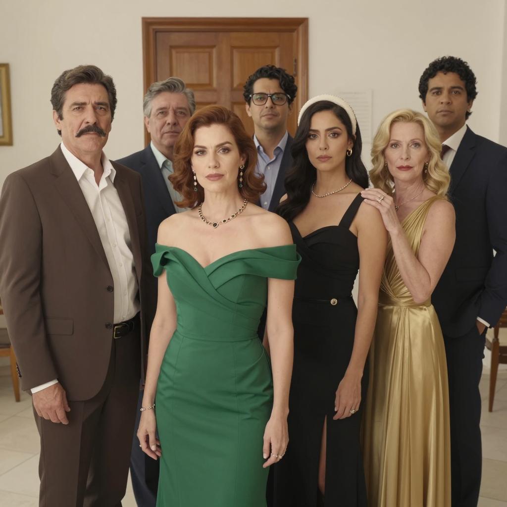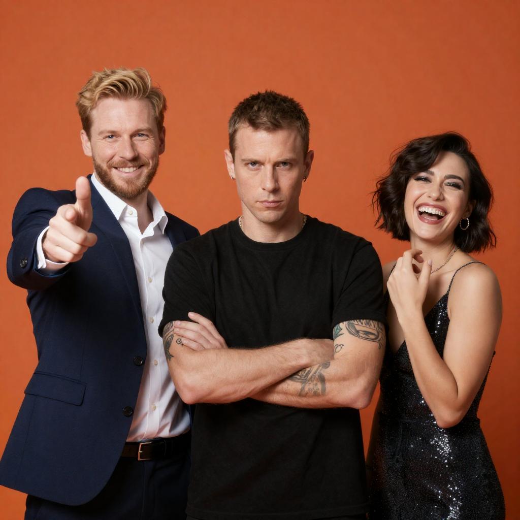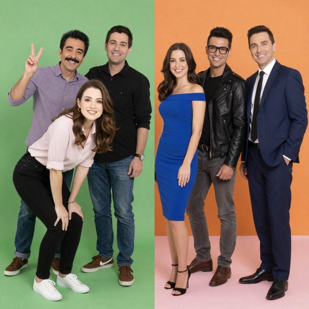 Photograph featuring two distinct groups of four adults each standing against vibrant colored backgrounds. The first group stands against a green backdrop and includes a man with a mustache wearing a purple shirt making a peace sign, a woman with brown hair in a light pink shirt leaning forward, a man with short hair in a black shirt, and another man in casual attire. The second group is positioned against an orange and pink background, showcasing a man in a blue suit with a white shirt and black tie, a woman in a blue off-shoulder dress with high heels, and a man in a black leather jacket and glasses. The image emphasizes fashion diversity and contrasting styles.