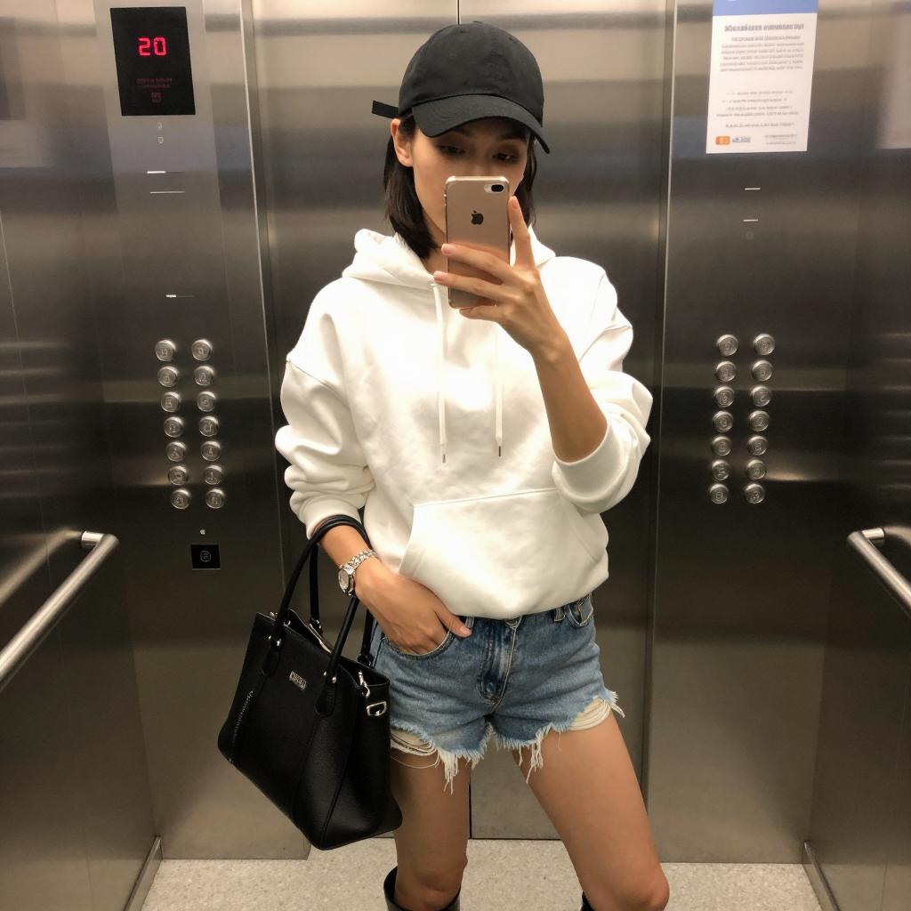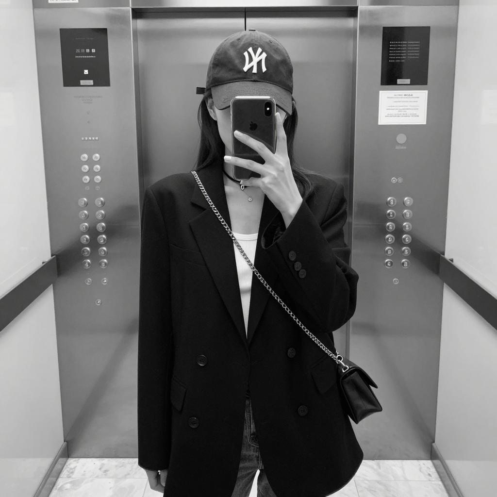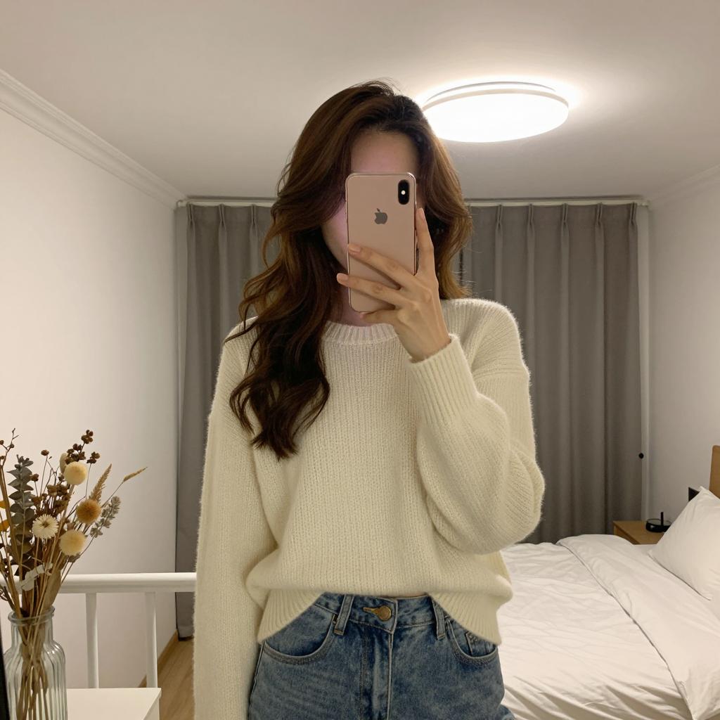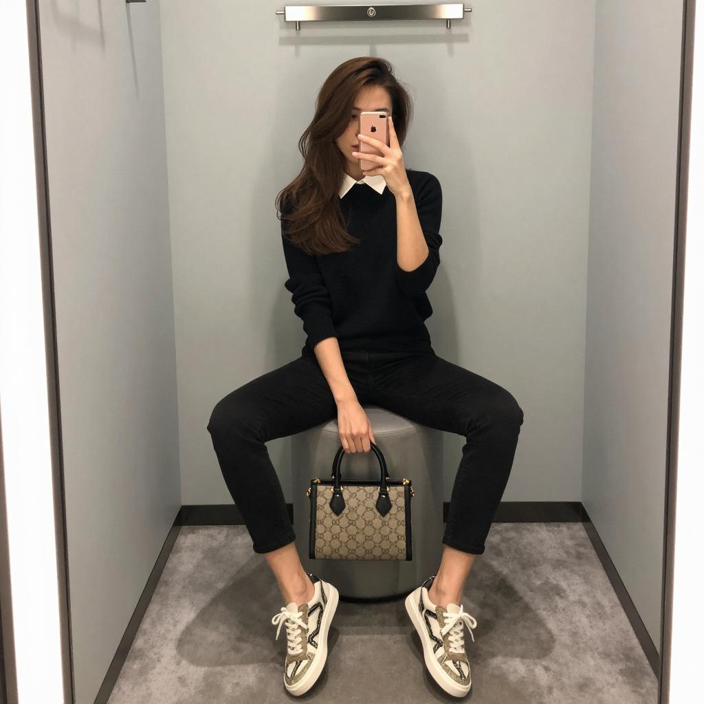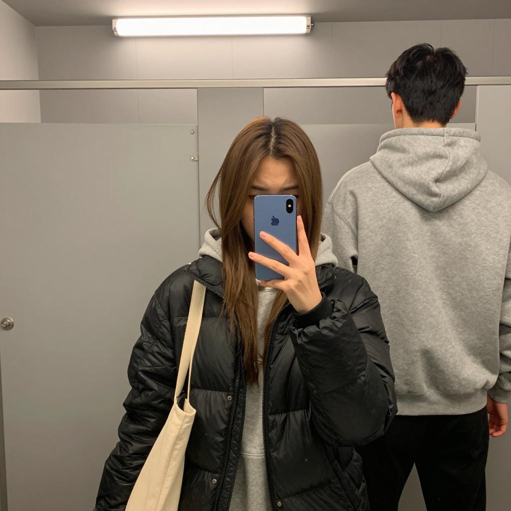 Woman with long dark hair, squatting, wearing white puffer jacket, black pants, white sneakers, taking mirror selfie with phone. Background has black door, white wall, carpeted floor, mirror frame, phone charger, yellow bag, and standing mirror. Mirror reflects her upper body and phone.
