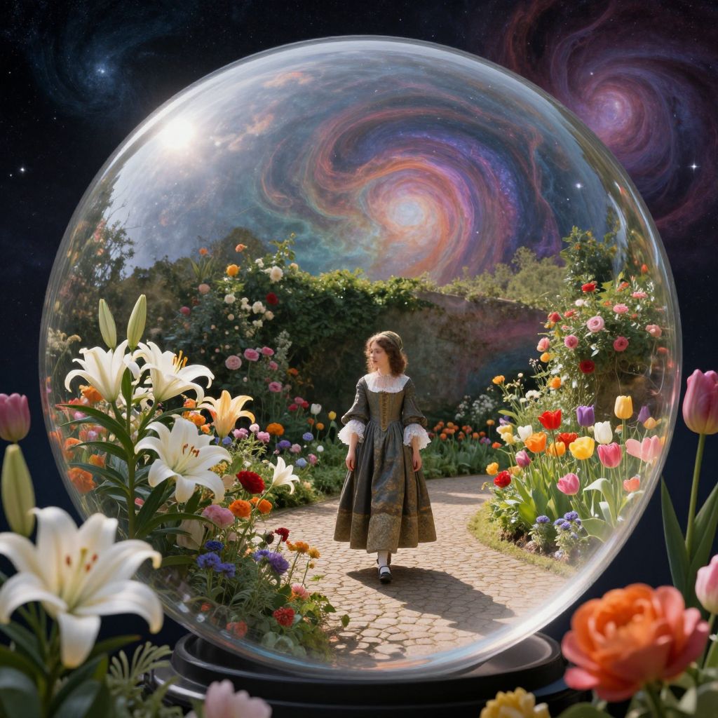 Envision an otherworldly dreamscape where the boundaries between time and nature blur. In the foreground, a verdant garden overflows with gravity-defying flowers that sprout from the ceiling, creating a waterfall of colors cascading into a silver pool below. A solitary figure in a detailed Victorian attire rests on a sofa made entirely of clocks whose hands spin erratically, contributing to an atmosphere both serene and unsettling. Capture this unique perspective as it merges the timeless with the natural world, inviting contemplation on the intricate relationship between these realms.
