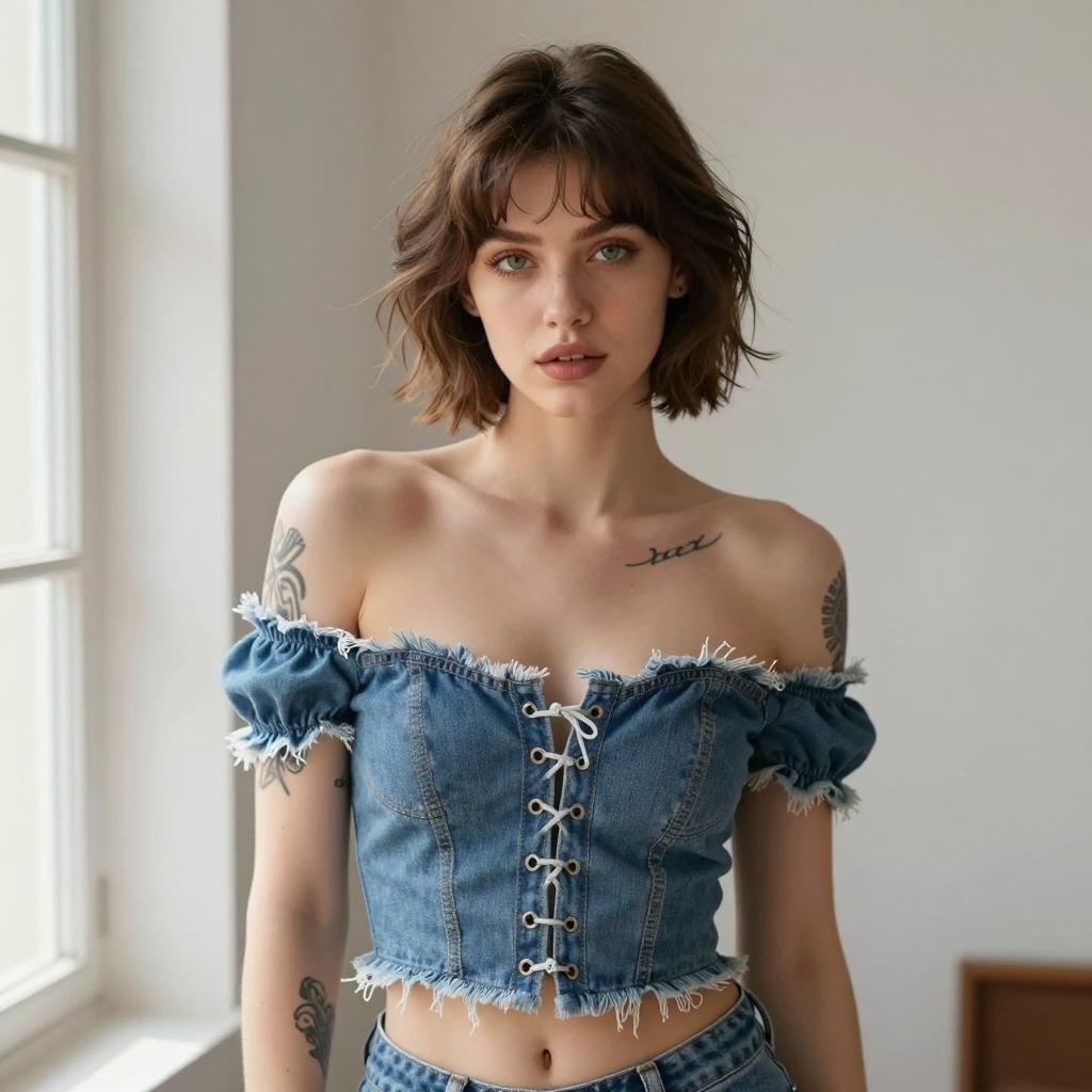 Portrait of an attractive young woman with short brown bob hairstyle and green eyes wearing an off-the-shoulder lace-up front denim corset crop top with frayed neckline. The woman has visible tattoos on both arms and shoulders and is posed in a sunlit corner of a room with soft natural window light creating soft shadows.