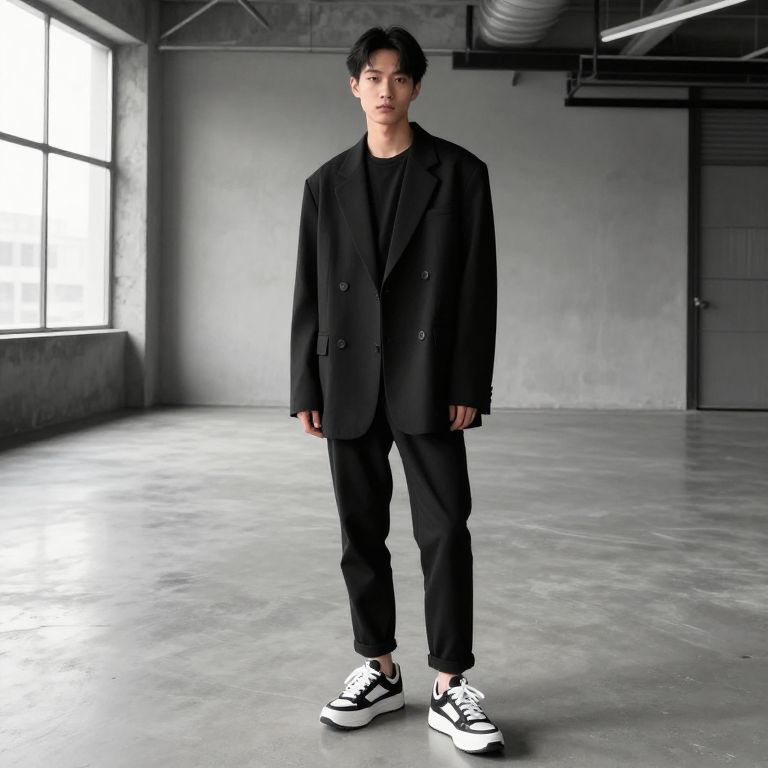 Androgynous outfits casual ensemble, standing in modern loft, monochrome palette, oversized blazers paired with sneakers, sleek hairstyle, urban minimalist backdrop
